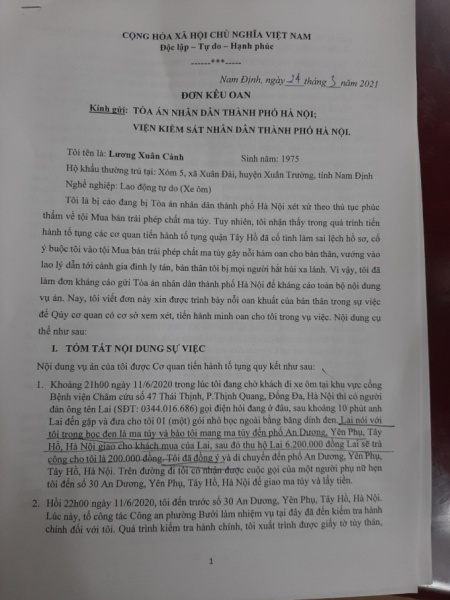 Tuy nhiên, anh Lương Xuân Cảnh cho rằng: “Trong quá trình tiến hành tố tụng các cơ quan tiến hành tố tụng quận Tây Hồ đã cố tình làm sai lệch hồ sơ, cố ý buộc tôi vào tội Mua bán trái phép chất ma túy gây nỗi hàm oan cho bản thân, vướng vào lao lý dẫn tới cảnh gia đình ly tán, bản thân tôi bị mọi người hắt hủi xa lánh.
