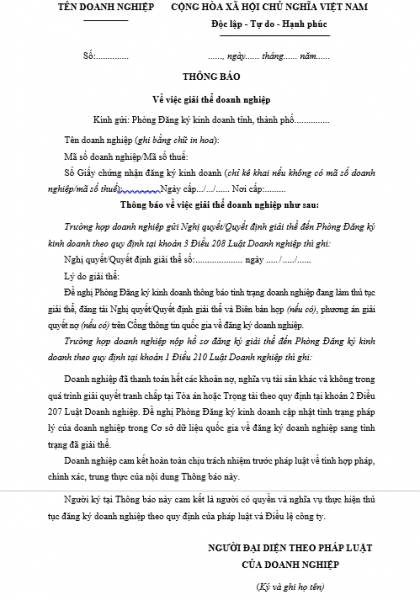 Mẫu thông báo về giải thể doanh nghiệp như sau: