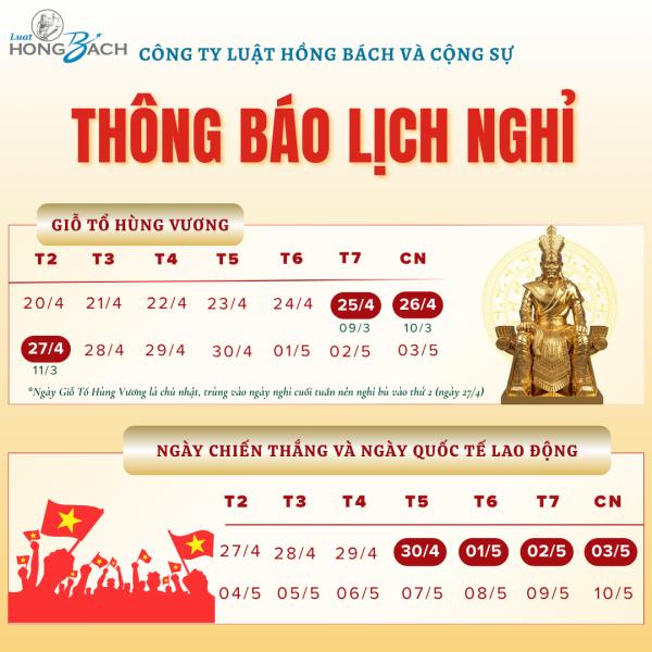 Công ty Luật Hồng Bách và Cộng sự xin thông báo lịch nghỉ Lễ Giỗ Tổ Hùng Vương và Ngày Giải phóng Miền Nam - Quốc tế Lao động như sau: