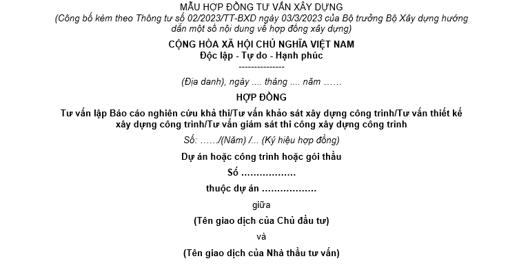 + Mẫu hợp đồng tư vấn xây dựng tại Phụ lục II kèm theo Thông tư này sử dụng cho loại hợp đồng tư vấn thực hiện công việc lập báo cáo nghiên cứu khả thi, khảo sát xây dựng, thiết kế xây dựng công trình, giám sát thi công xây dựng công trình.