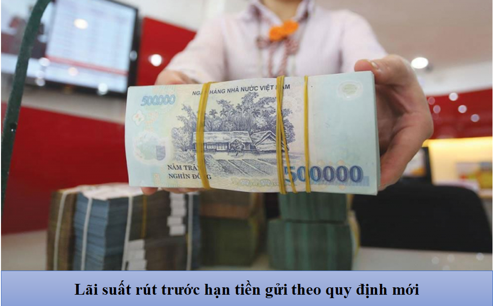 - Đối với phần tiền gửi rút trước hạn: áp dụng mức lãi suất bằng lãi suất tiền gửi không kỳ hạn thấp nhất của TCTD đó theo đối tượng khách hàng và/hoặc theo loại đồng tiền đã gửi tại thời điểm rút trước hạn.